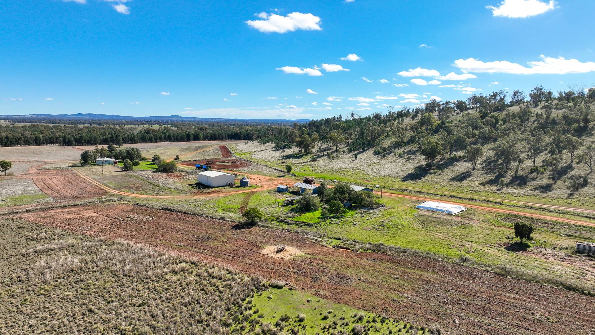 Country: The land features gently undulating red loam soils transitioning to heavier basalt soils, with some stony areas. It is largely cleared for cultivation and grazing, with a central elevated ridge area, part of the Booboomarah Ridges, consisting of undulating timbered basalt soils. The soil composition varies from chocolate brown to red sandy loams near the ridge base, becoming heavier in the northern and southern sections. The property is dotted with timber, mainly Box, River Gums, Kurrajong, and some Pine. Last year, 600 acres were sown with crops. About two-thirds of the property has been left fallow for the past two years, promoting regeneration and providing abundant feed for livestock. Additionally, approximately 60 acres are sown with tropical grasses.