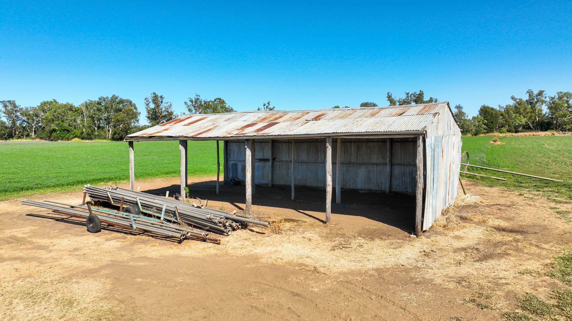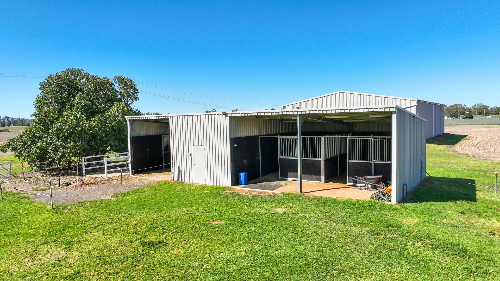 Improvements are extensive and include a five-bay steel and Colorbond hay shed with power and lighting, a three-stable complex with tack and feed room, wash bay, and separate equipped well, plus an additional machinery shed. Horse paddocks around the stables are fully electrified.