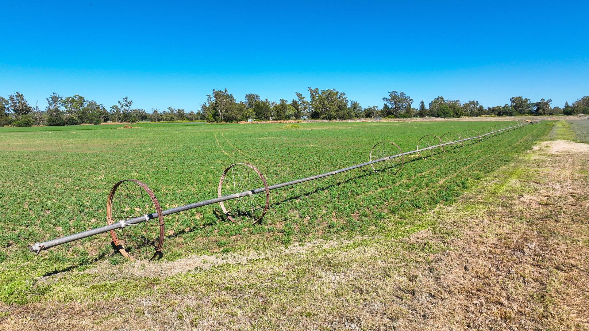 The property is well watered with a 102 ML groundwater allocation, serviced by two modern well stations featuring electric pumps, concrete liners and recent upgrades (2023). Comprehensive irrigation infrastructure includes underground mains throughout the property, side-roll systems, and hand-shift irrigation equipment.